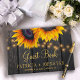 A rusticidade vintage livro convidado personalizado de estilo tradicional, com grandes girassóis de ouro amarelo e cordas de luzes cintilantes sobre um fundo de madeira castanho escuro e com elegante roteiro de tipografia de ouro. Ideal para o verão ou outono | elegante país russo | casamentos temáticos no quintal do jardim ao ar livre.