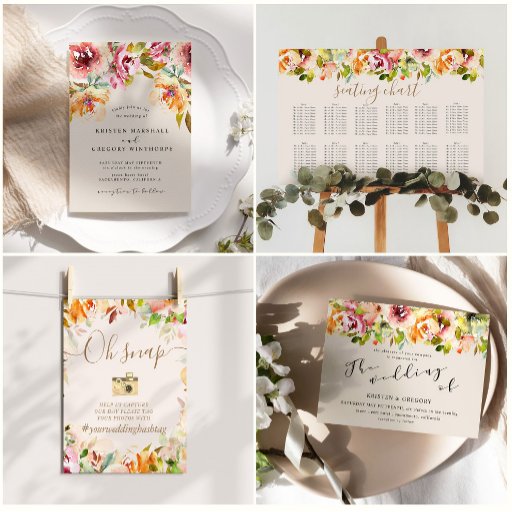 Nossa coleção "Casamento Floral do Jardim de Verão" apresenta lindas flores de aquarela em um lindo esquema de cor de verão de amarelos vibrantes e laranjas emparelhadas com um roteiro elegante. Veja na nossa loja mais itens desta coleção.
