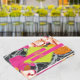 Forma de diamante amarelo neon sobre laranja rosa e cor de pêssego floral moderno com design marmorizado escuro. Nomes em néon amarelo sobre bares rosa-quente. O texto restante é preto.