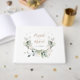 Elegante livro de hóspedes para o seu casamento com aquarelas de sage verde eucalipto verde verde, folhas de louros com sotaques dourados, seus nomes em um roteiro de ouro na moda e sua data de casamento na tipografia moderna das cinzas.
