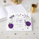 Romântica, roxo real e flores brancas com folhas prateadas, livro de convidados botânicos. Os detalhes da brilha são simulados.