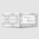 Design apresenta um fundo branco faux-satin para o monograma do casal recém-casado. O centro exibe o sobrenome inicial em uma fonte grande, elegante, prateada. A primeira inicial de noiva e noivo é exibida em ambos os lados na mesma fonte, mas menor. As palavras, "OBRIGADO" são apresentadas abaixo. Dentro é vazio esquerdo.