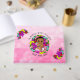 Uma adorável garotinha desenhada de desenho animado com pele mais escura para representar bebês hispânicos, biraciais ou afro-americanos cercados por flores e um fundo rosa. Personalize o seu livro de convidados de chás de fraldas na área de personalização, adicionando a mãe ao nome do bebê e a data do chá de fraldas.