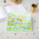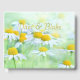 Campos verdejantes de margaridas encantadoras formam a frente e o verso. O amarelo dourado dos centros das flores polido a ouro está em uma fonte fluida e fácil de ler para os nomes do casal, do homenageado ou da empresa, pois essas flores alegres são muito adaptáveis.