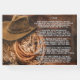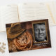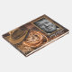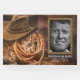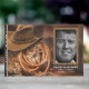 Livro de visitas de funeral e memorial com tema de cowboy com chapéu, corda e fardo de feno em um fundo de madeira rústica com moldura de imagem de corda rústica. Este livro de visitas de funeral com tema de cowboy western é facilmente personalizado, basta adicionar a foto e o texto de sua escolha na frente, verso e lombada.