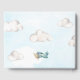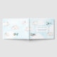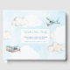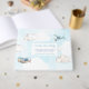 Diversão e design de um livro de convidados para um chá de fraldas temático da aviação / aniversário / festa do Batismo, com um céu azul com nuvens brancas e fofinhas e aviões de brinquedo bonitos em tons de azul e menta.