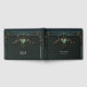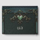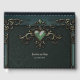 Design de colheita elegante e romântica. O fundo verde-escuro da safra dá ao design um toque de eterno, enquanto o quadro do ornamentado fecha harmoniosamente a imagem geral. Um grande coração verde esmeralda adornada com delicados sotaques de ouro e embutido em um florescimento decorativo simboliza o amor e a conexão do casal. O foco principal é na silhueta de uma noiva e um noivo desenhados de forma artística, unidos numa dança graciosa.