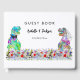 Se vocês dois amam dinossauros então este é um dinossauro muito colorido que o livro de hóspedes temido é para vocês com noiva de dinossauro psicodélico engraçado e noivo em um prado pré-histórico de flores silvestres. Fácil de usar o modelo para que você possa adicionar nomes e a data do casamento no estilo de casamento temático de dinossauro pré-histórico. Tyrannosaurus rex dinos e aquarela florais de verão em tons roxos, azuis, verdes, amarelos e laranja. Arte original da artista Catherine Sweetman