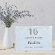 Um fundo azul de bebê na moda com falso brilho prateado, cintilações e número 16 escrito com uma fonte estilo balão. Adicione seu nome, data. Spine: adicione seu texto.