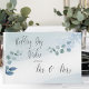 Livro de convidados de casamento com espinha personalizada e escrito com "desejos de casamento para o novo sr. e mrs.". O cobrir é decorado com folhas de eucalipto, inscrições à mão e lavagem a aquarelas. Esse delicado design tem um verde-aquarela e folhagem em tons de cinza azul empoeirado e verde. Um design natural, rústico e não-floral, que se adapta a uma variedade de temas, desde jardim clássico até boho orgânico e mínimo moderno. Por favor, navegue na minha loja, na coleção empoeirada de eucalipto, para coordenar papelaria e dia de decoração de eventos ou me mande criar quaisquer modelos adicionais que você precise.