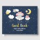 Este bonito e caprichoso livro de hóspedes apresenta um adorável elefante bebê num arco rosa sentado numa nuvem com estrelas em queda. Ao fundo está um céu noturno estrelado e lua crescente. O texto combina o script manuscrito e as fontes sans serif para uma aparência na moda e moderna. Isto é perfeito para um chá de fraldas.