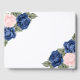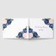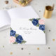 Elegante livro de visitas memorial floral inspirado em rosas azuis e rosadas e gipsófila em um fundo branco liso.