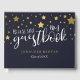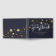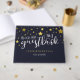 Guestbook de graduação em azul marinho com estrelas douradas em volta de "por favor assine meu guia" em uma fonte peculiar, escrita à mão.