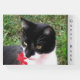 Foto fantástica de um gato - um tuxedo preto e branco contra a grama verde-clara e flores vermelhas vibrantes. Adicionar informações na coluna para o evento e a data