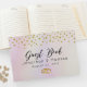 Um livro de convidados de casamento com um confete de ouro falso esborrifado ao longo do topo. 2 anéis de casamento de ouro abaixo do seu texto personalizado. Um fundo de cor d'água pálido e amarelo.