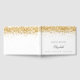 Um guia para uma festa de formatura feminina e glamourosa. Um fundo branco com pó dourado falso. O texto: O nome é escrito com um moderno script de estilo escrito à mão. Com o texto: Formando - classe de 20xx (ou qualquer ano). Adicione seu texto na coluna.