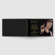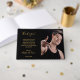 Para uma celebração moderna e moderna de graduação. Na frente: Adicione sua própria foto, e uma nota de agradecimento para seus convidados. Ouros. Adicione seu próprio texto na coluna. Fundo: fundo preto.