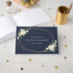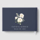 Adicione um toque pessoal à sua celebração de casamento com estes itens de na moda e festa memoráveis! Design apresenta flores brancas de aquarela e verde sobre fundo azul marinho.