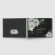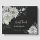 Livro de convidados único com flores brancas românticas e folhas verdes em fundo preto. PARA MAIS PRODUTOS CORRESPONDENTES, clique na coleção acima ou entre em contato comigo.
