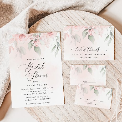Adicione um toque pessoal à celebração do seu chá de panela com estes itens de na moda e festa memoráveis! Design apresenta flores cor-de-água rosa pinceladas e verde sobre fundo rosa pálido.