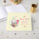 Um livro de hóspedes de chá de fraldas ilustrado com elementos florais cor-de-rosa e verde. Projetado com um ovo de aquarela giro sentado dentro um cesto marrom mais wicker. A cesta é decorada com fitas, arcos, flores e pequenos corações também. Um flamingo cor-de-rosa e coelho branco parado perto.