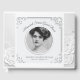 Um simples, elegante e clássico design de quadros brancos para um serviço memorial clássico e personalizado ou outros eventos comemorativos. Estilo de recorte de papel com rosas correspondentes e ilustração de pérolas no verso. Substitua a foto e o texto do retrato de exemplo por você.