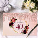 Um livro convidado para uma festa de aniversário de 40 anos. Um ouro chic e fundo cor-de-rosa pincelado com uma estrutura geométrica falsa dourada. Decorados com flores roxas escuras e burgueiras, rosas e penas do estilo "boho". Rosa dourado pinga, pintura pingada na frente e atrás. Modelos para um nome, 40 anos e uma data. Data de nascimento ou data da festa. O nome é escrito com um script de estilo manuscrito, letras cor-de-rosa, idade em roxo e data com números pretos. Adicione seu texto na coluna.