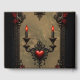 Gótico Romance: Paixão Oculta. Um quadro de ornamentado no estilo gótico, desenhado com filigrana fina e preta, com linhas delicadas e detalhes intrincados que lembram as antigas entalhes de ornamentado. Incorporados no quadro estão rosas vermelhas brilhantes, suas flores velozes criando um contraste vibrante com o filigre escuro, ressaltando o humor romântico. Os ornamentos em forma de coração enfeitam os cantos e bordas do quadro. Duas velas pretas com chamas vermelhas brilham suavemente, dando à imagem geral um toque quente, ligeiramente sombrio.