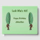 Este livro de hóspedes personalizado para a sua festa ou celebração é verde com dois homens engraçados em ternos castanhos com grandes picles verdes para cabeças que surpreenderam rostos de aparência. Personalize suas informações na frente com o modelo.