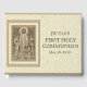 Esta é uma imagem tradicional da Primeira Comunhão Católica apresentando Jesus oferecendo um jovem garoto ajoelhado e uma menina Comunhão Santa. Está cercado por uma borda e fundo cor de renda. Os anjos olham carinhosamente de cima.
