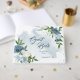lindos tons azuis e flores brancas com algumas folhas verdes, livro de convidado botânico. São simulados os detalhes do brilho dourado