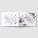 lindas flores lilás roxas e brancas com algumas folhas verdes, livro de convidado botânico. São simulados os detalhes do brilho dourado