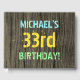 Este design de aniversário divertido apresenta uma mensagem como "33º ANIVERSÁRIO DO MICHAEL!", onde o nome pode ser personalizado. O fundo apresenta um padrão de aparência rústico, castanho e falso em grãos de madeira. O texto de mensagem personalizável apresenta cores como azul, amarelo e verde, e tem uma aparência inspirada pela de letras pintadas e estêncilhadas. Um livro de hóspedes com tema de aniversário como este pode ser usado em uma festa sendo realizada para alguém que comemora seus trinta e três anos, para que convidados e participantes possam deixar mensagens. [~Z0000320]