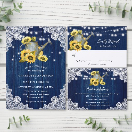 Marinho azul rústico livro de hóspedes florais, com uma velha lata de rega e girassóis sobre um fundo de madeira adornado com rendas florais brancas e luzes de cordas. Este livro de hóspedes é ideal para um país rústico marinho, quintal, jardim ou festa de casamento de celeiro inspirado em flores de girassol.