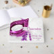Este livro de hóspedes tem uma máscara de mascarada festiva roxa rodeada de penas brancas e inclui uma fita de miçangas roxas. Enquanto mostrado como Quinceanera, isso pode ser personalizado para qualquer evento.