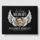 Livro de hóspedes personalizado do serviço funerário/memorial, com uma foto cardíaca do seu ente querido no centro das asas de anjo, o texto "na memória amorosa", o seu nome e as datas de nascimento/morte.
