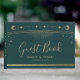 Real Mystical Green Sun Moon Stars Astronomy Celestial Cosmic Space Wedding Guest Books apresenta um sol dourado, lua e estrelas num fundo verde. Adicione seus nomes abaixo na tipografia moderna do roteiro. Projetado pelo Evco Studio. Ver www.zazzle.com/store/evcostudio para mais produtos nesta coleção