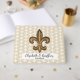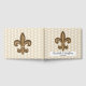 Guestbook de casamento com um símbolo de fêmur de lis de grande ouro e um padrão menor de fêmur de lis branco sobre uma cor de fundo bege neutra. Inclui os nomes dos casais.