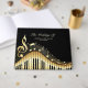 Ilustração preta e dourada de um teclado musical com anotações e clave e ouros brilhantes