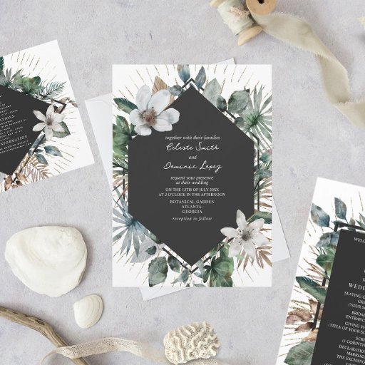 Design botânico tropical em volta de diamante de cinza escura com texto branco.