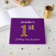 Este design de livro convidado apresenta o número ordinal "1rua" com uma aparência falsa em ouro. Ele também apresenta um nome personalizado, e um fundo de cor roxa. Pode ser usado em uma festa para alguém comemorando seu primeiro aniversário. [~Z0000057]