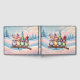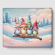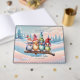 Pássaros bonitos com chapéus de Natal. Os pássaros são vibrantemente coloridos, têm grandes olhos que exaltam alegria e curiosidade. O fundo apresenta um céu suave de inverno em cores pastéis, com flocos de neve delicados a cair lentamente. A design exude calor e alegria, capturando perfeitamente o espírito festivo da época de férias.