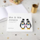 Gráfico de pinguins de noivos e noivos impressos em um livro de hóspedes. Personalizável para o novo Nome do casal e data do casamento. Não se esqueça de personalizar a coluna!