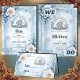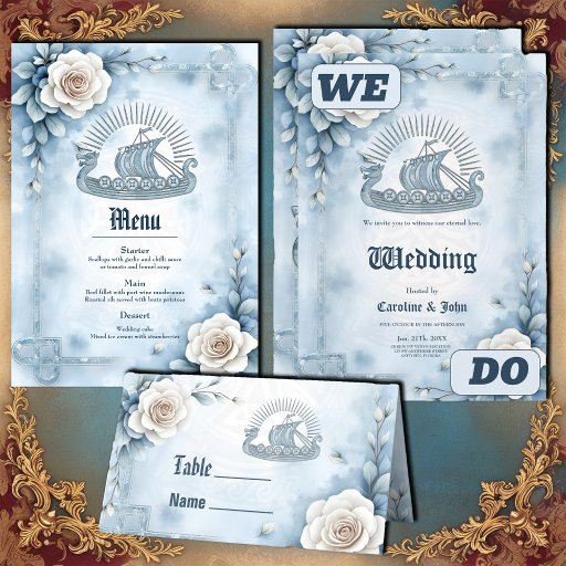 Quadro Floral com Rosa e Design Celta. A imagem apresenta um delicado quadro floral com uma estética suave e sonhadora. As rosas brancas com sutis centros beges e folhas azul-esverdeadas enfeitam os cantos superior esquerdo e inferior direito. A estrutura em si é construída a partir de um design azul-gelo, inspirado por Celta. Um padrão de nó Celta esmaecido e circular é visível no fundo.