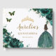 Prepare seu dia especial para os anos virem com um livro de hóspedes. Apresentando uma garota marmelada no vestido verde esmeralda, flores verdes esmeraldas bonito e borboletas esmeraldas e douradas. Personalize-o com seus detalhes de forma fácil e rápida, basta pressionar o botão personalizar para reorganizar e formatar o estilo e a colocação do texto. c) O Feliz Cat Studio