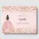 Um guia para uma Quinceañera feminina e glamourosa, festa de aniversário 15. Um fundo metálico falso de na moda rosa de ouro com brilho falso, brilhos e uma garota vestindo um vestido princesa, vestido de bola. Personalize e adicione seu nome e idade/data. O nome é escrito com um script de estilo escrito manualmente Spine: adicione seu próprio texto.