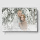 This wedding guest book cover features a serene winter scene with two individuals standing closely in a snowy forest, surrounded by snow-covered trees. The color palette is dominated by cool whites and grays, contrasted with the warm tones of their clothing, creating a harmonious blend that enhances the wintery feel. The design uses elegant serif typography for customizable names and dates at the bottom center, adding a classic touch to the romantic theme. The overall mood is intimate and tranquil, perfect for celebrating an engagement or wedding in a picturesque setting.
