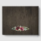 Design apresenta um fundo de grãos de madeira estampado com uma estrutura geométrica de cor dourada que é decorada com rosas vermelhas burgundy, elementos florais de pincel, girassóis, eucalipto e outros verdes.