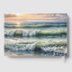 Waves gently crash onto the shore, illuminated by the soft glow of the setting sun. The sky reflects hues of orange and pink, surrounded by scattered clouds.
