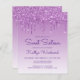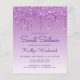 Este convite de aniversário Doce Dezesseis apresenta uma borda brilhante de falso roxo e borda púrpura de ombre. As palavras "Doce Dezesseis" e o nome do convidado de honra aparecem em um guião casual de escrita manual roxa, com o resto do texto personalizável na fonte sans serif. O mesmo design de gota a gota roxa aparece no verso.
